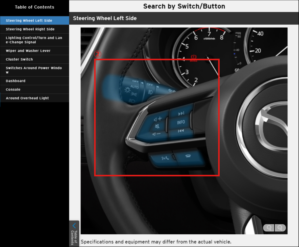 You can search for the information you need by clicking on the position of a switch or button.