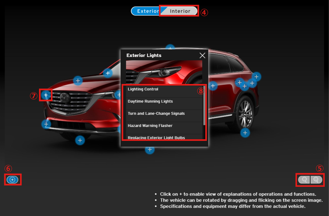 In addition, if you are using a mobile phone or other computer device which has a gyroscope function, the angles in the interior of the vehicle can be switched by moving the device (vehicle interior images only).