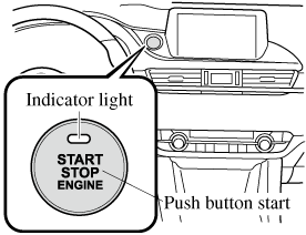 Press the push button start after both the KEY indicator light (green) (if equipped) in the instrument cluster and the push button start indicator light (green) illuminate.