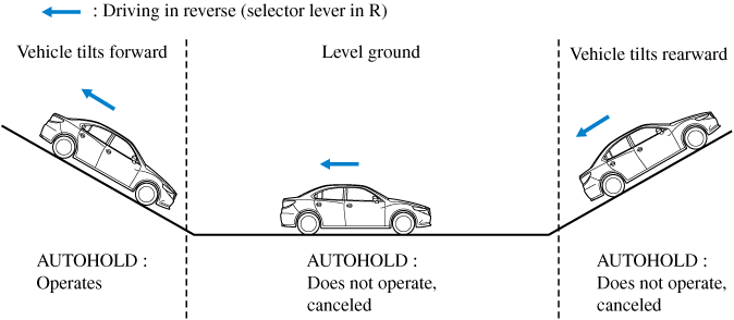 The AUTOHOLD is canceled when the selector lever is shifted to R position while the vehicle is on level ground, or facing up a hill or grade (as shown below).