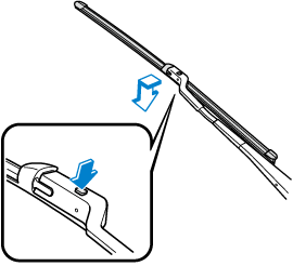 2. Slide the blade component in the direction of the arrow while pressing the wiper arm tab to remove the blade component from the wiper arm.