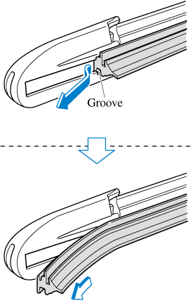 • Do not bend the blade rubber unnecessarily when replacing it. Otherwise, the metal stiffener in the blade may deform and the windshield wiper operation may be adversely affected.