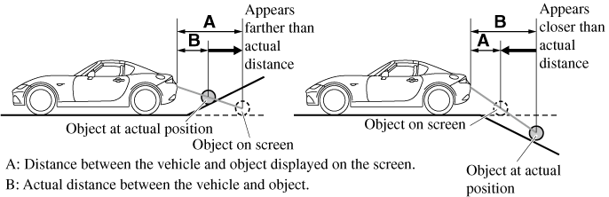 When there is a steep upgrade (downgrade) behind the vehicle, the object displayed on the screen appears farther (downgrade: closer) than the actual distance.