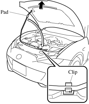 Lift the hood, grasp the padded area on the support rod, and secure the support rod in the clip. Verify that the support rod is secured in the clip before closing the hood.