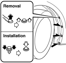 Pull the center of each plastic retainer and remove the retainers, and then partially peel back the mudguard.