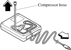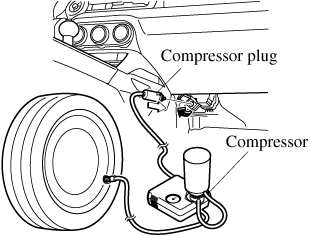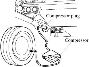 After driving the vehicle for about 10 minutes or 5 km (3 miles), connect the air compressor to the tire using Step 9 of the procedure, and check the tire inflation pressure using the tire pressure gauge on the air compressor. If the tire inflation pressure is lower than the specified tire inflation pressure, turn the air compressor on and wait until it reaches the specified tire inflation pressure.