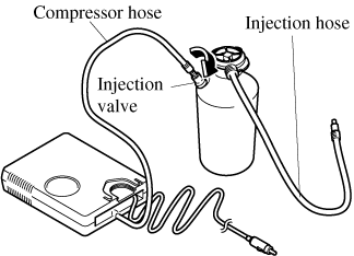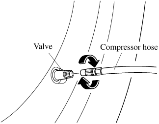 Make sure that the air compressor switch is off before inserting the air compressor hose to the injection valve of the bottle. If the air compressor hose is not installed to the injection valve of the bottle securely, the sealant may leak.