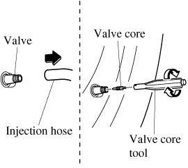 If there is air remaining in the tire when the valve core is removed, the valve core could fly out. Remove the valve core carefully.