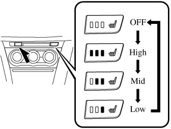 Press the seat warmer switch while the ignition is switched ON to operate the seat warmer. The indicator lights turn on to indicate that the seat warmer is operating. The mode changes as follows each time the seat warmer switch is pressed.