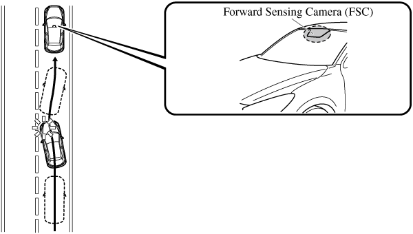 The system detects the white or yellow lines on the traffic lane using the Forward Sensing Camera (FSC) and if it determines that the vehicle may be deviating from its lane, it notifies the driver using the active driving display (vehicles with active driving display), and by flashing the LDWS warning light and activating the LDWS warning beep.