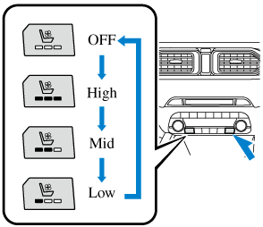 Press the seat ventilation switch while the ignition is switched ON to operate the seat ventilation. The indicator lights turn on to indicate that the seat ventilation is operating. The mode changes as follows each time the seat ventilation switch is pressed.