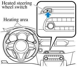 Press the switch to turn on the heated steering wheel. The heated steering wheel operates for about 30 minutes and then turns off automatically.