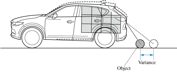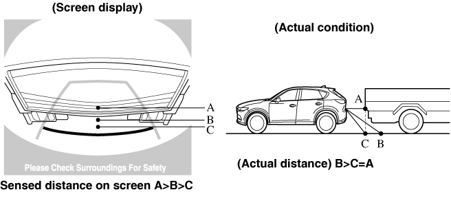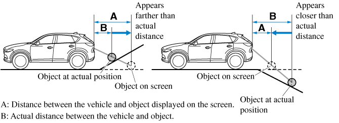 When there is a steep upgrade (downgrade) behind the vehicle, the object displayed on the screen appears farther (downgrade: closer) than the actual distance.