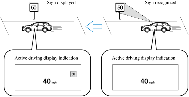 If the vehicle speed exceeds the speed limit sign indicated in the active driving display while the vehicle is driven, the system notifies the driver using the indication in the active driving display and a warning sound.