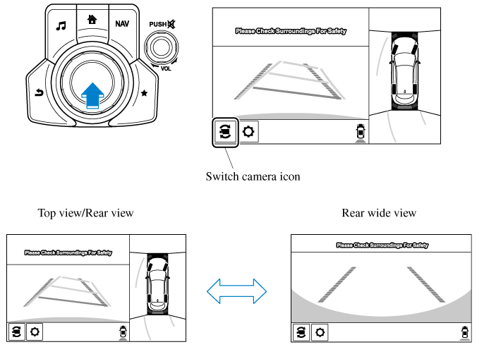 The displayed screen can be switched by pressing the commander knob or by touching the switch camera icon on the screen while the top view/rear view, rear wide view is displayed.
