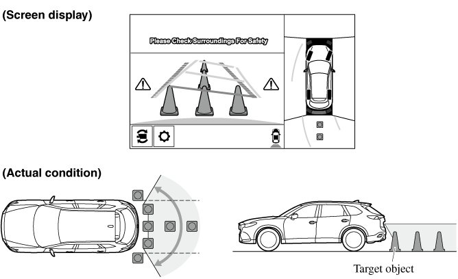 The parking sensor detection range has limitations. For example, obstructions closing in from the side and objects short in height may not be detected. Always confirm the safety around the vehicle visually when driving.