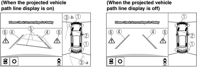 Indicates the approximate projected path of the vehicle. Moves in conjunction with the steering wheel operation. a) Indicates the path where the rear wheels are expected to travel. b) Indicates the path where the outer side of the vehicle is expected to travel. |