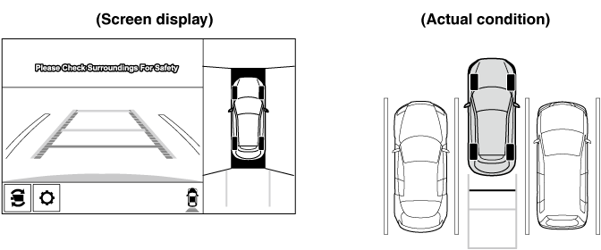 Because there might be a difference between the image displayed on the screen, such as indicated in the following, and the actual conditions when parking, always check the safety at the rear of the vehicle and the surrounding area directly with your eyes.