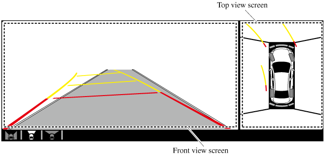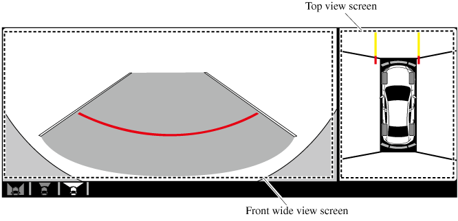 Displays the image of the area around the vehicle and the front of the vehicle (wide-area).