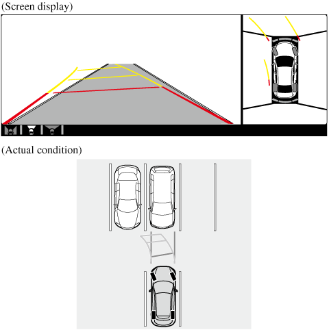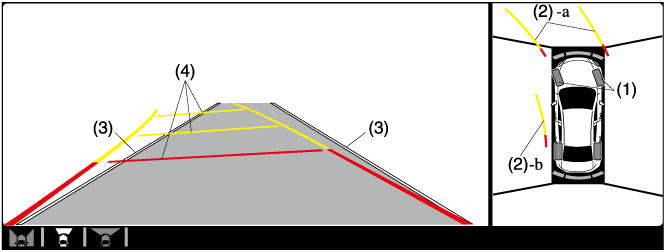 Indicates the approximate projected path of the vehicle. Moves in conjunction with the steering wheel operation. a) Indicates the path where the edge of the front bumper is expected to travel. b) Indicates the path where the inner side of the vehicle is expected to travel. |