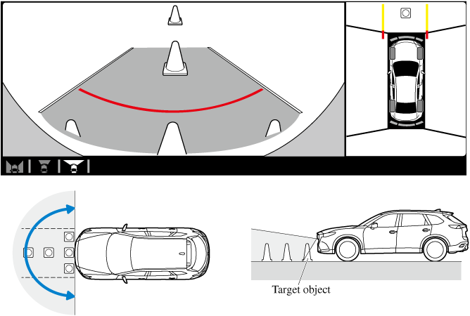 Indicates the approximate width of the vehicle and the distance (from front end of bumper) in front of the vehicle.
