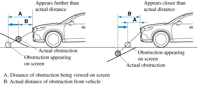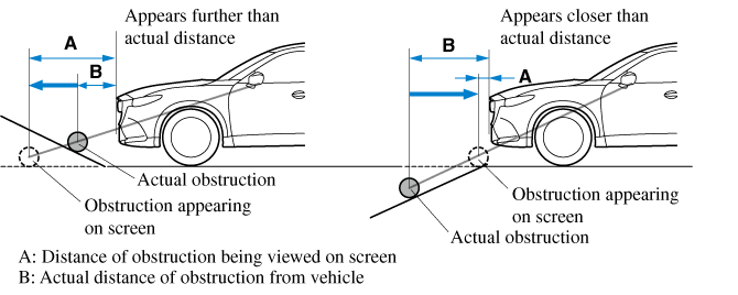 If the vehicle is on a slope, obstructions taken by the camera can appear farther or closer than the actual distance from the vehicle.