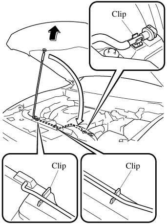 2. Lift the hood, grasp the padded area on the support rod, and secure the support rod in the clip. Verify that the support rod is secured in the clip before closing the hood.