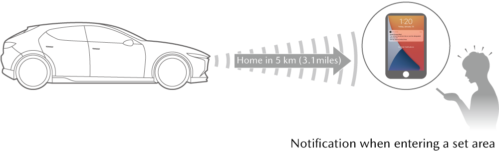 By setting the area, time of day, and vehicle speed in the MyMazda APP, the system notifies your cell phone when you enter or leave a specified area, drive outside of specified hours, or exceed a specified speed.