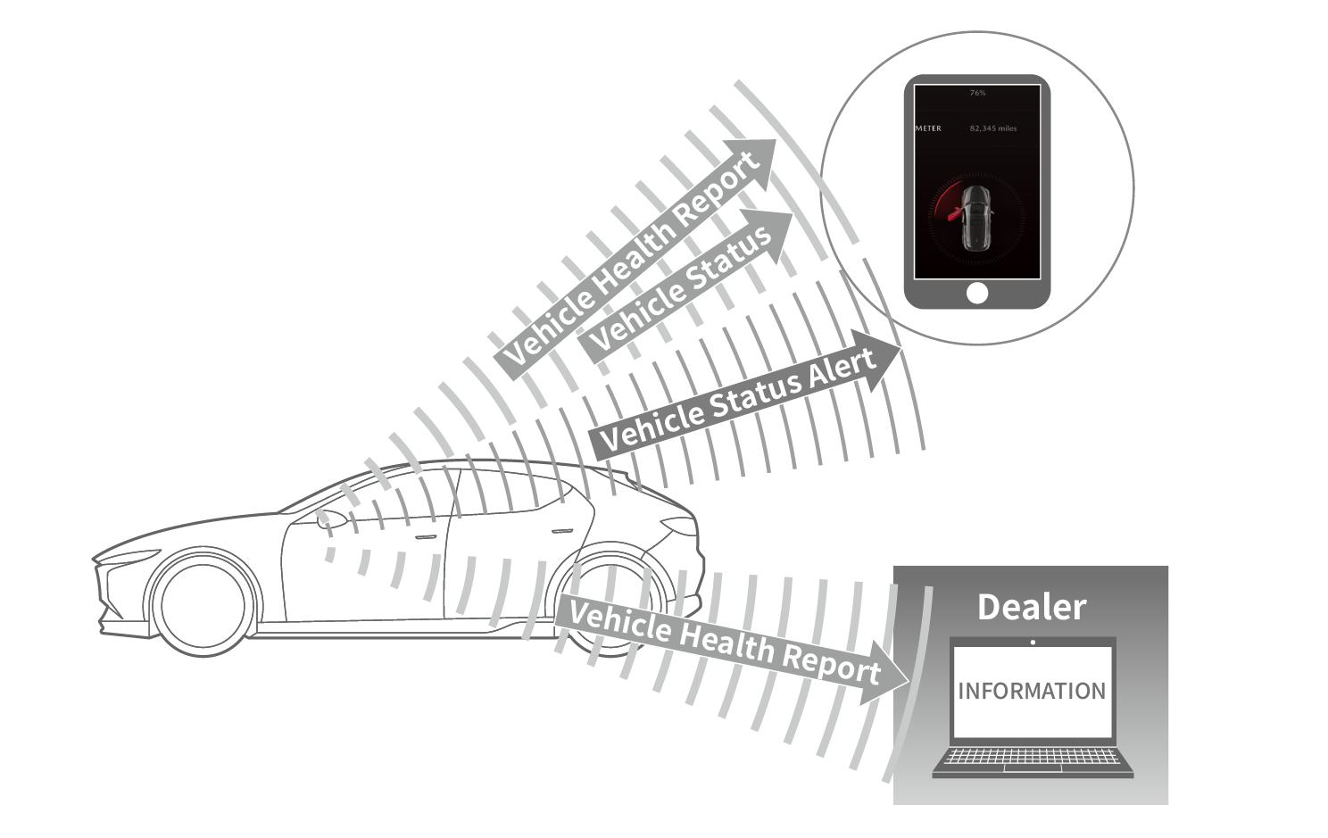 Vehicle maintenance related information such as engine oil or tire pressure can be checked using the MyMazda APP and the App can be set to notify the customer when set maintenance schedules are approaching. The Vehicle Health Report information can also be accessed by dealers or the Customer Experience Center via the Connected Service system, ensuring maintenance discussions are accurate.