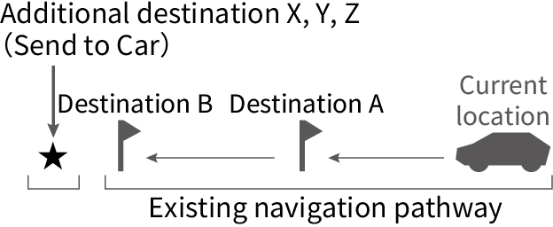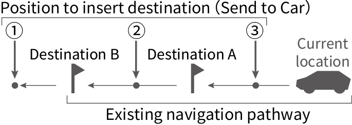 • Up to 10 destinations can be set to the navigation route. If you exceed the maximum number of destinations sent by Send to Car, either discard the routes the vehicle already set and set the received destination as the new destination, or cancel the received destination.