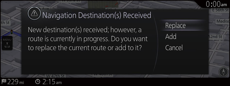 Select whether the received destination is to be set as a new destination or to be added to the existing route.