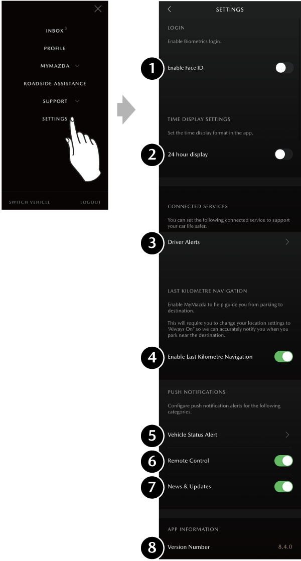 8 Version Number Displays the MyMazda APP version number.