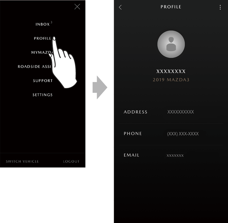 1 SWITCH VEHICLE With the MyMazda APP, remote operation and information confirmation can be done for a single vehicle. If multiple vehicles have been registered and you want to switch to a different vehicle, touch the vehicle and then touch CONFIRM.