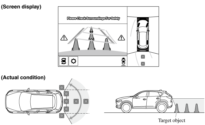 The parking sensor detection range has limitations. For example, obstructions closing in from the side and objects short in height may not be detected. Always confirm the safety around the vehicle visually when driving.