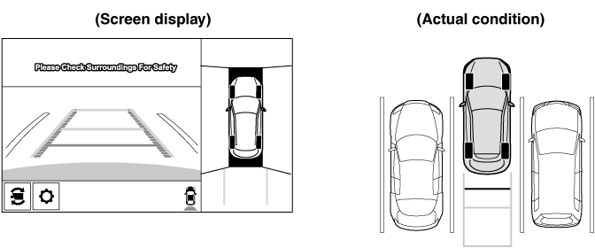 Because there might be a difference between the image displayed on the screen, such as indicated in the following, and the actual conditions when parking, always check the safety at the rear of the vehicle and the surrounding area directly with your eyes.