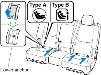 The ISOFIX/LATCH*1 lower anchors marking on the cover indicates the position of the ISOFIX/LATCH*1 lower anchors for the attachment of a child-restraint system.
