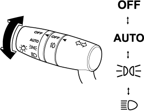 If the headlight switch and the windshield wiper switch are in AUTO, and the wipers are operated at low or high speed by the auto wiper control for several seconds, bad weather conditions are determined and the headlights may be turned on.