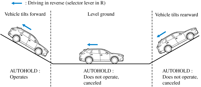 • The AUTOHOLD is canceled when the selector lever is shifted to R position while the vehicle is on level ground, or facing up a hill or grade (as shown below).
