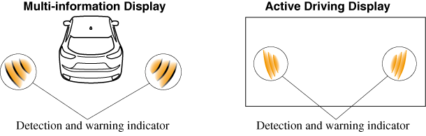 The detected approaching vehicle and warning are displayed in the multi-information display and active driving display when the vehicle is moving forward (BSM operational).