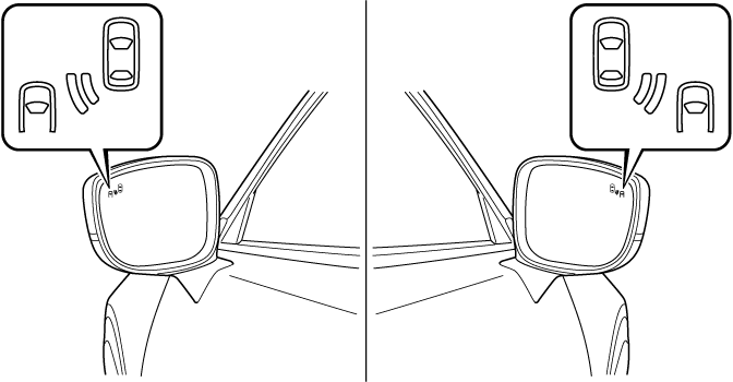The BSM detects vehicles approaching from the rear and turns on the BSM warning indicator lights equipped on the door mirrors according to the conditions. Additionally, while a BSM warning indicator light is illuminated, if the turn signal lever is operated to signal a turn in the direction in which the BSM warning indicator light is illuminated, the BSM warning indicator light flashes.