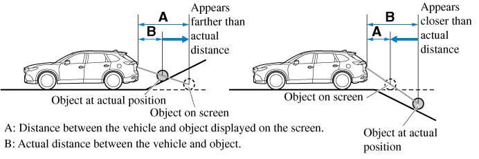 If the vehicle is on a slope, obstructions taken by the camera can appear farther or closer than the actual distance from the vehicle.