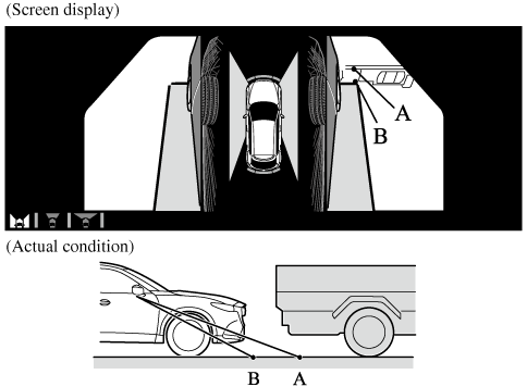 Because the vehicle front end guide lines (side camera) or the distance guide lines (rear camera) are displayed based on a flat surface, the distance to the three-dimensional object displayed on the screen is different from the actual distance.