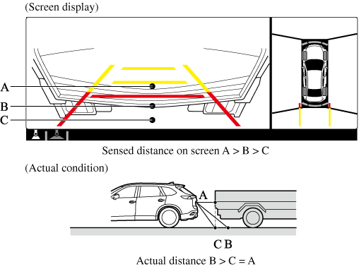 If there is a steep up or down grade in the road at the front or rear of the vehicle, obstructions picked up by the camera can appear farther or closer than the actual distance from the vehicle.