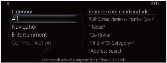 When the Barge-In setting is on, voice commands can be made even while the voice guidance is being announced. For details on Barge-In, refer to the System Settings section in the Mazda Connect Owner's Manual.