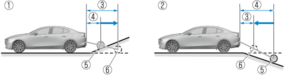 When there is a steep upgrade (downgrade) behind the vehicle, the object displayed on the screen appears farther (downgrade: closer) than the actual distance.