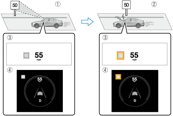 1. Vehicle is doing 55 mph when 50 mph speed limit sign is recognized.
