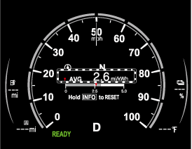 To reset the displayed average energy efficiency data, press the INFO switch for 1.5 seconds or longer. After resetting the data, - - - kWh/100 km (- - - mile/kWh) is displayed before the average energy efficiency is recalculated and displayed.