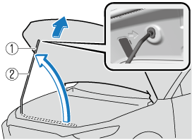 2. Insert your hand into the hood opening, slide the latch lever in the direction of the arrow as shown in the illustration, and lift up the hood.