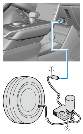 After driving the vehicle for about 10 minutes or 5 km (3 miles), connect the air compressor to the tire using Step 8 of the procedure, and check the tire inflation pressure using the tire pressure gauge on the air compressor. If the tire inflation pressure is lower than the specified tire inflation pressure, turn the air compressor on and wait until it reaches the specified tire inflation pressure.