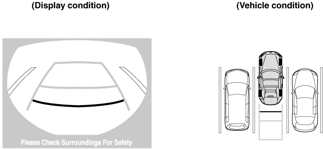 • When parking in a space with a division line on only one side of the parking space, the division line and the vehicle width guide line appear aligned in the monitor, but they may not actually be aligned on the ground.